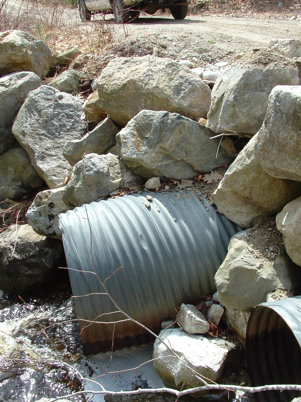 Photo showing the outlet of the culverts on Ash Bog Stream in Maine. Outlets are perched during most of the summer and the undersized culverts lead to overwash and sedimentation in the stream.